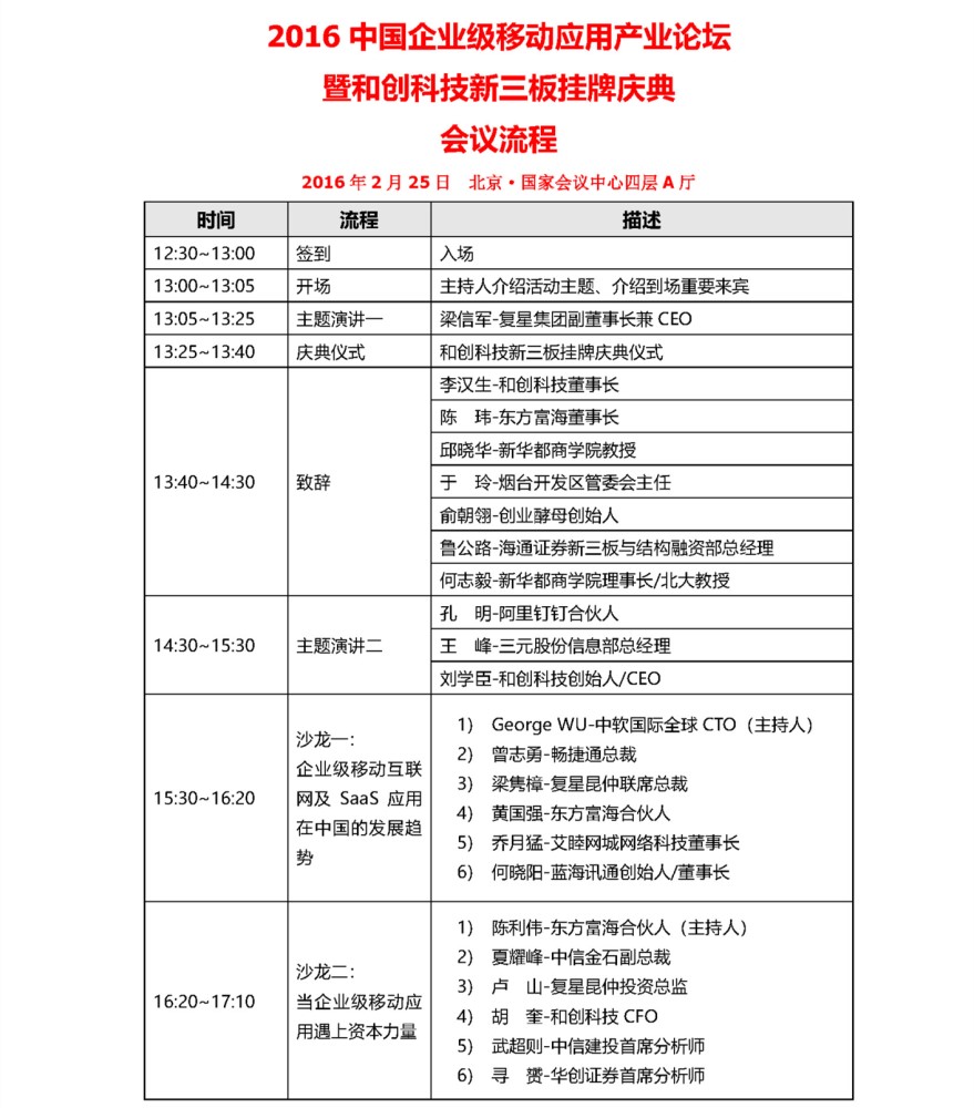 和創(chuàng)科技(證券代碼834218)作為中國企業(yè)級移動互聯(lián)網(wǎng)SaaS應(yīng)用第一股,是在和創(chuàng)科技各位股東、客戶、合作伙伴及團隊的長期支持和卓越努力下,服務(wù)了國內(nèi)近十萬家企業(yè)。作為產(chǎn)業(yè)級SaaS移動應(yīng)用的領(lǐng)軍企業(yè),和創(chuàng)科技將聯(lián)合復(fù)星昆仲、東方富海、新華都商學(xué)院于2016年2月25日下午在北京國家會議中心共同舉辦“2016中國企業(yè)級移動應(yīng)用產(chǎn)業(yè)論壇暨和創(chuàng)科技新三板掛牌慶典”,這即是答謝各位股東朋友們的長期支持,也是剖析產(chǎn)業(yè)級SaaS行業(yè)在產(chǎn)品研發(fā)、市場營銷、運維續(xù)費和資本進入等方面的行業(yè)主題。