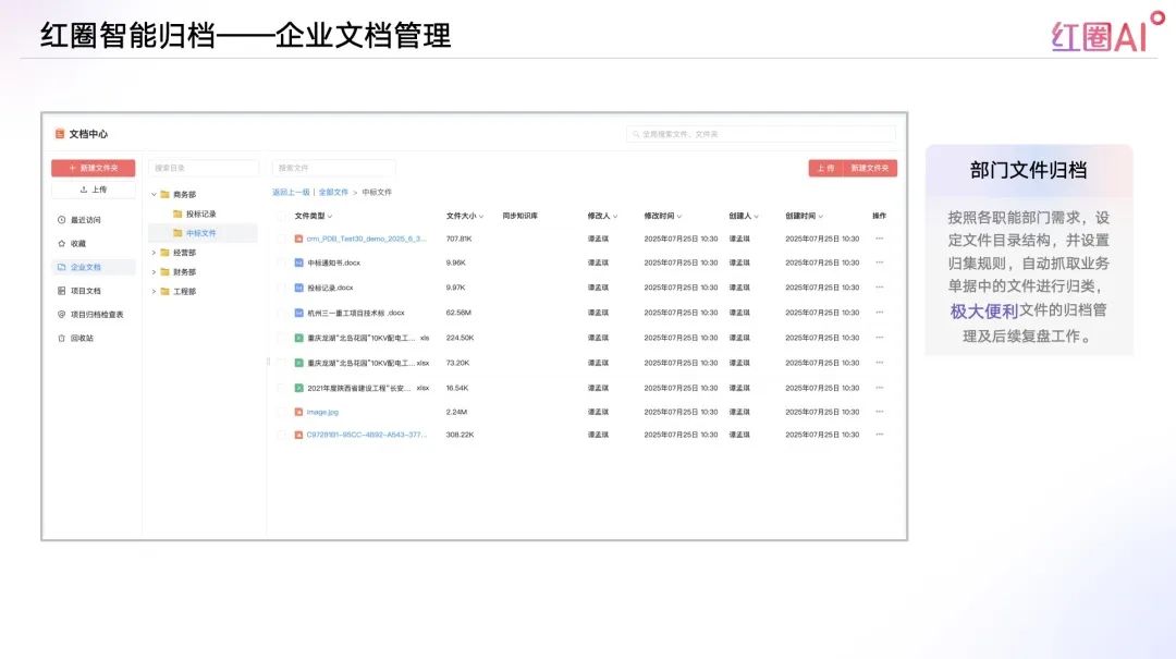 以往投標流程中,資料查找和內容比對耗時耗力、風險頻發。紅圈AI通過快速檢索歷史標書、技術方案、成功案例等內容,助力企業建立專屬“投標智庫”,讓策略制定更具數據支撐。