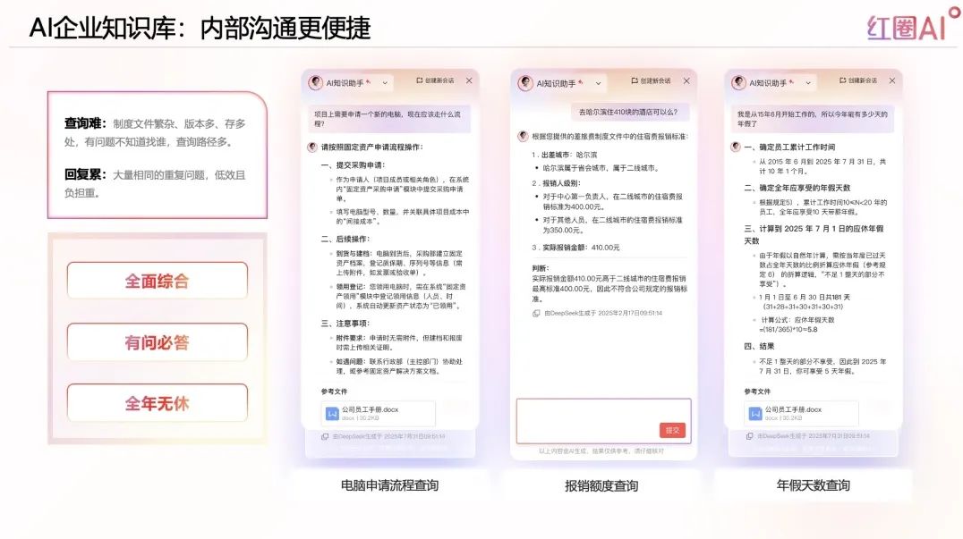 紅圈AI,以大模型+智能檢索技術為引擎,構建企業知識資產體系,實現“經驗即問即答”,推動企業從“人找知識”走向“知識找人”。
