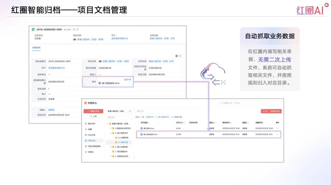 在紅圈內填寫相關單據,無需二次上傳文件,系統可自動抓取相關文件,并按照規則歸入對應目錄;