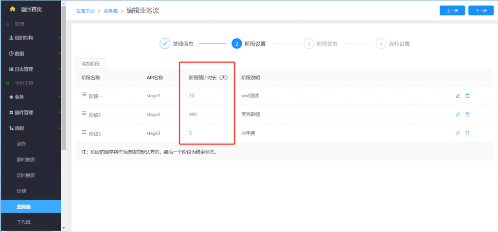 業務流階段設置中 增加階段計劃時長,并在業務流組件中展示計劃和實際時長;支持用階段任務驅動階段自動流程
