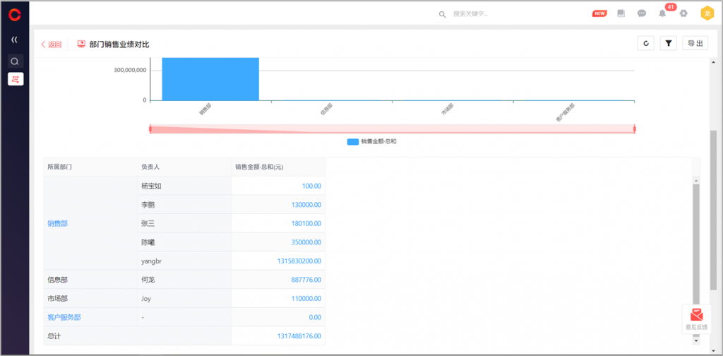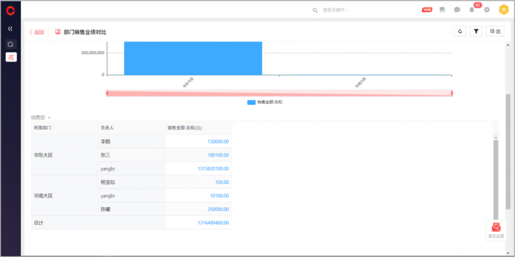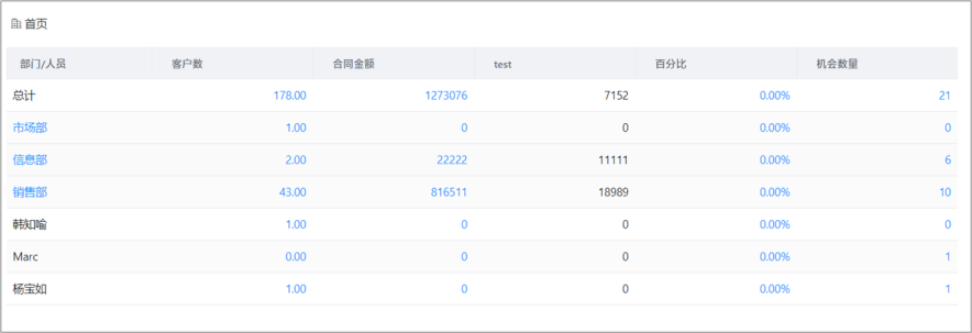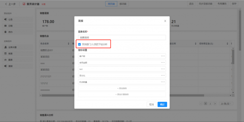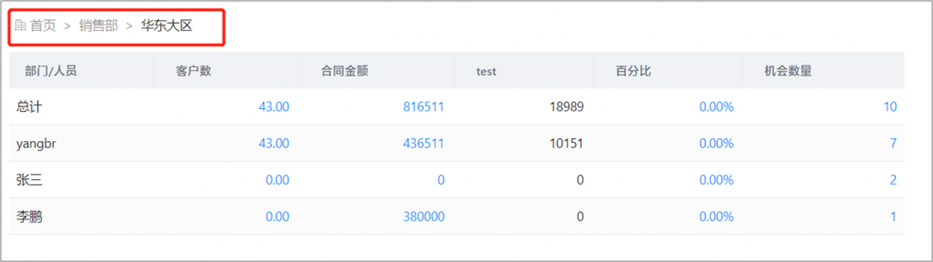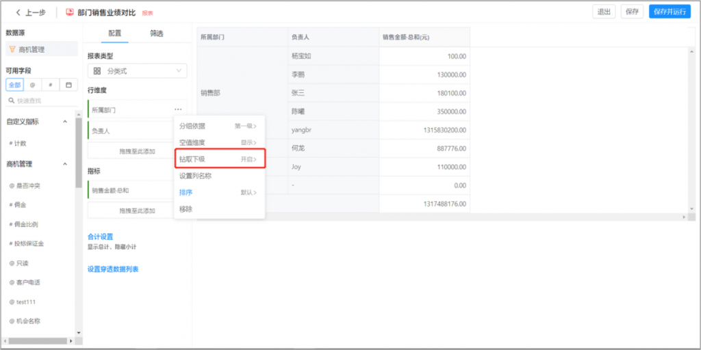 自定義報表支持部門下鉆:當以部門為維度時,可開啟部門下鉆,逐級查看下級部門的分析數據