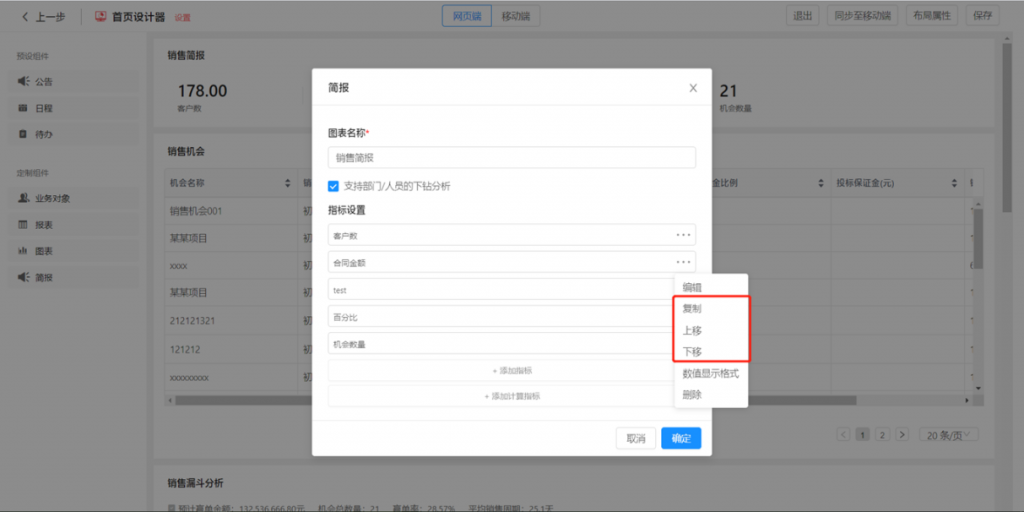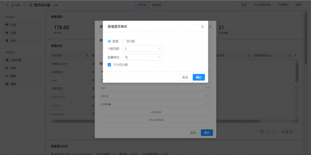 數值顯示格式:指標都支持數值顯示格式的設置,可設置單位、小數位數、百分比等