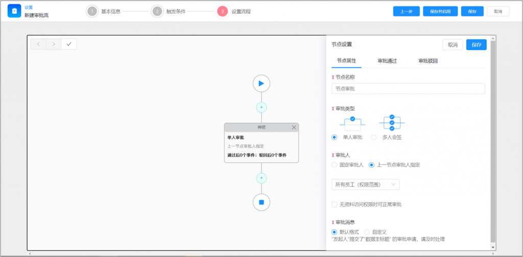 復制審批流時,支持將節點中的可復制信息帶入到新流程中,如節點名稱、類型、審批人、抄送人、意見和其他通用設置