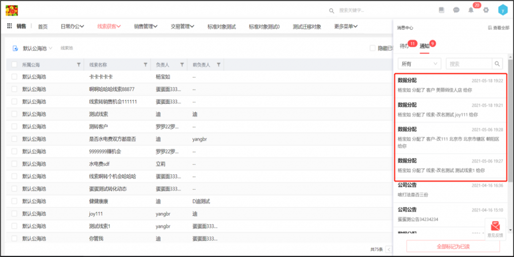 線索池、客戶池管理員分配數據后,系統會給新負責人發通知提醒