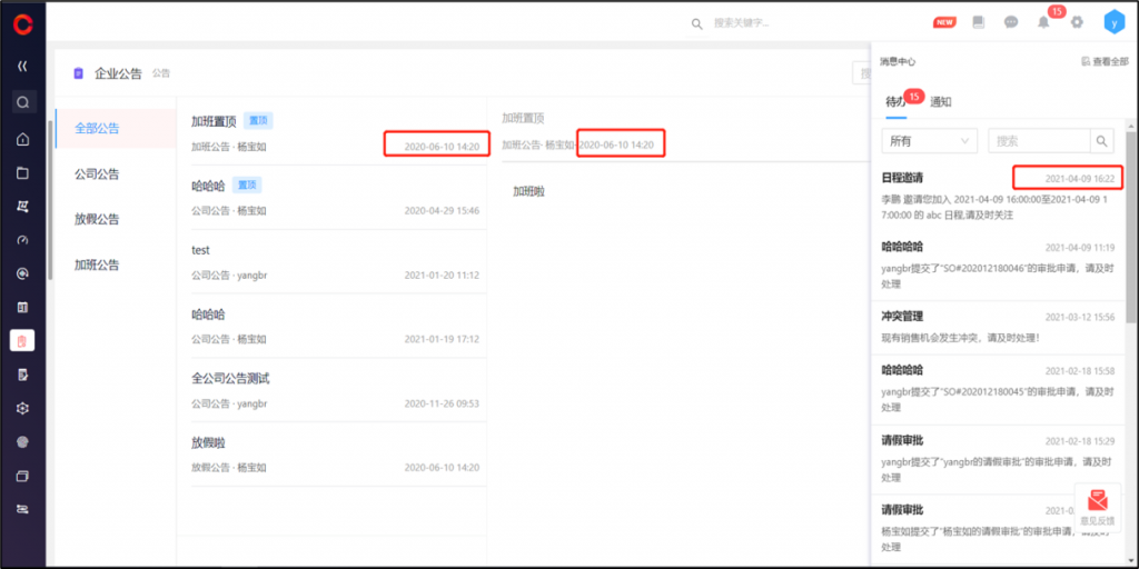 通知、待辦、公告、動態、審批流歷史中的時間顯示完整時間,如2021-05-21 10:11,時間留痕更嚴謹。