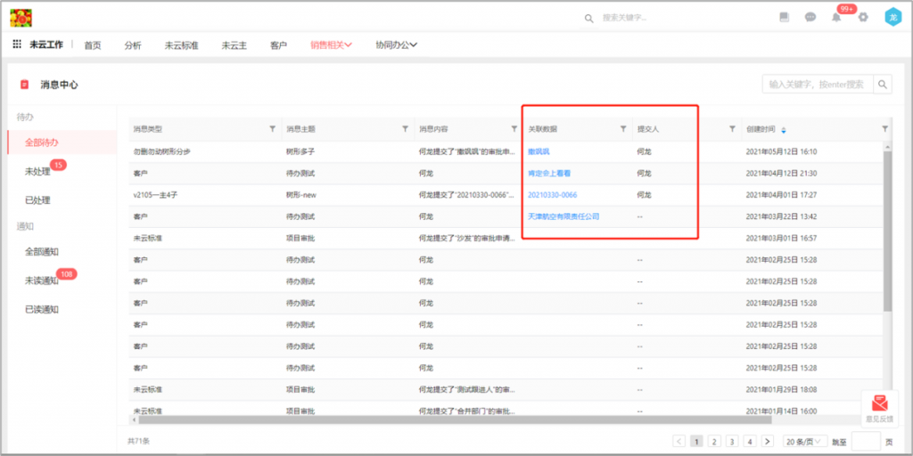 web端待辦顯示提交人和關聯數據標題:web端消息中心,待辦消息中增加提交人和關聯數據的信息顯示