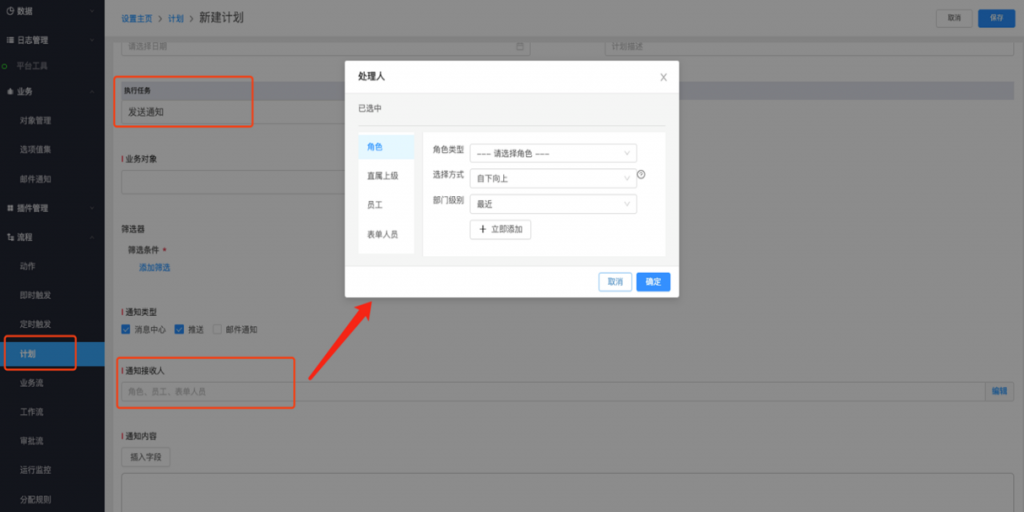 計劃的通知接收人選人組件優化:計劃的通知接收人選人組件支持按角色、直接上級、員工、表單人員的維度