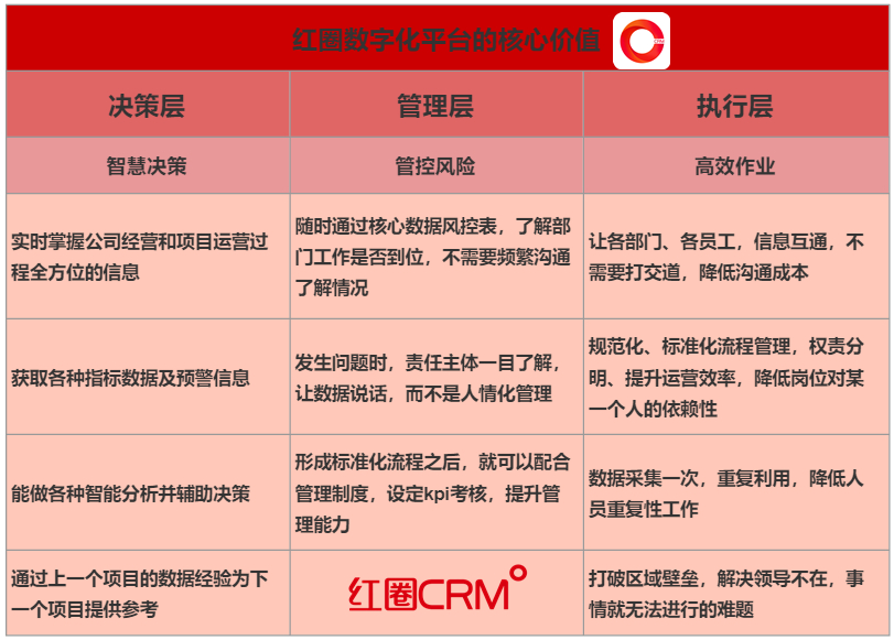 紅圈工程項目管理系統(tǒng)可實現(xiàn)數(shù)字管理。數(shù)據(jù)資產(chǎn)沉淀和分析,?撐組織決策。 服務(wù)于企業(yè)階段性目標(biāo)的達(dá)成。 以組織建設(shè)、?才選拔,人才復(fù)制,提升組織能力。