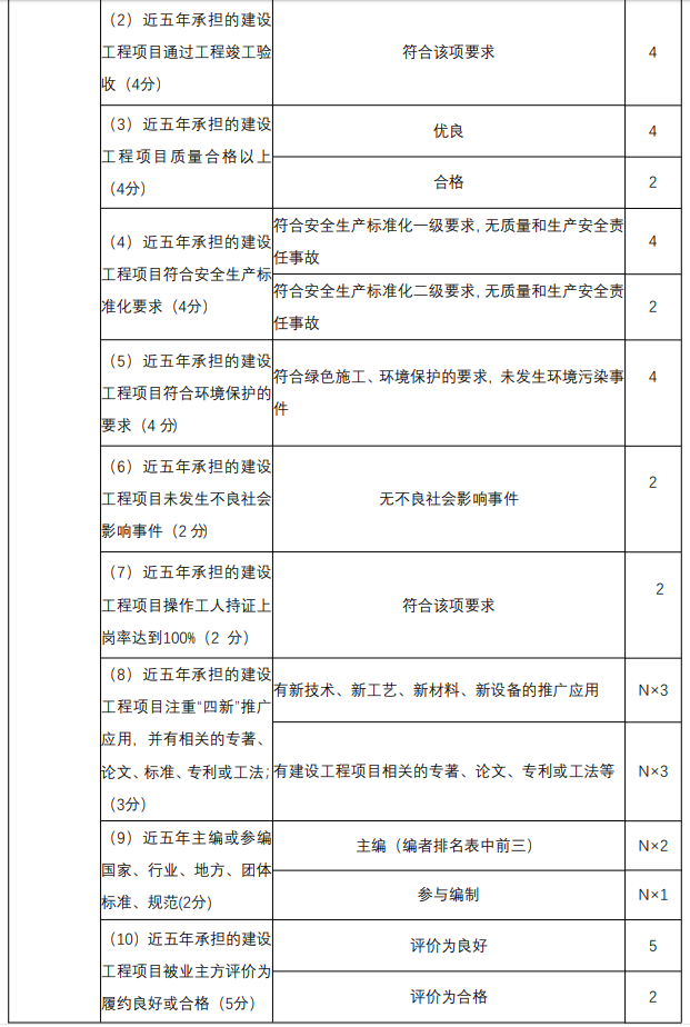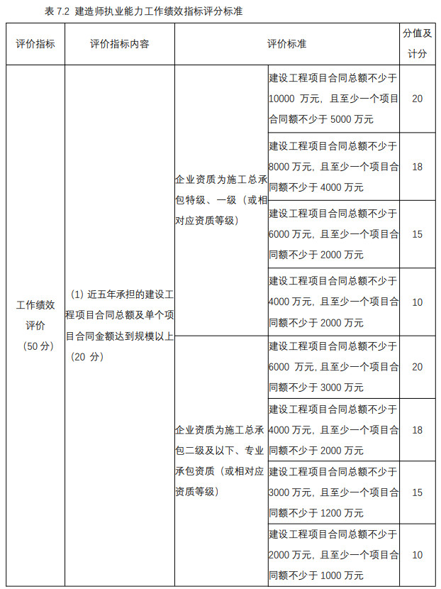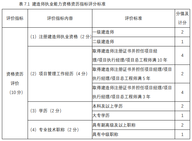 建造師執(zhí)業(yè)能力資格資歷指標(biāo)按下表中的標(biāo)準(zhǔn)評(píng)分。