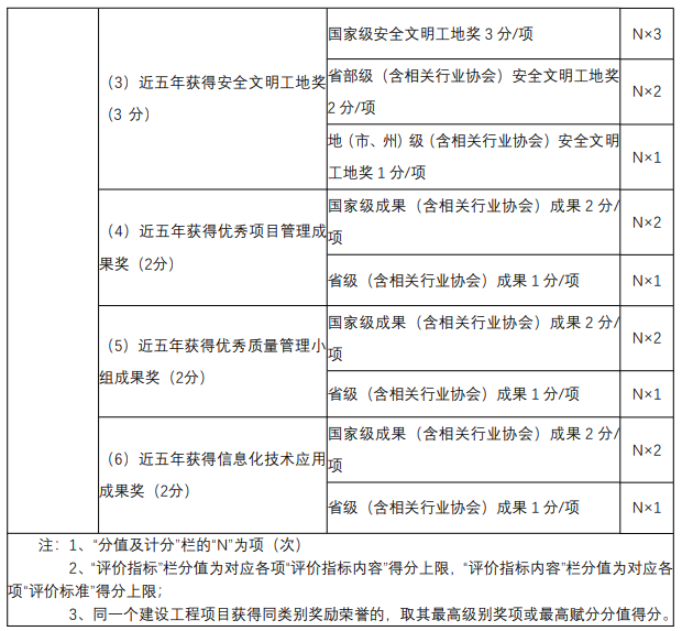 近五年獲得的榮譽(yù)獎(jiǎng)勵(lì)評(píng)價(jià)指標(biāo)內(nèi)容包括:①工程建設(shè)相關(guān)個(gè)人獎(jiǎng)勵(lì);②工程質(zhì)量獎(jiǎng);③安全文明工地獎(jiǎng);④優(yōu)秀項(xiàng)目管理成果獎(jiǎng);⑤優(yōu)秀質(zhì)量管理小組成果獎(jiǎng);⑥信息化技術(shù)應(yīng)用成果獎(jiǎng)。