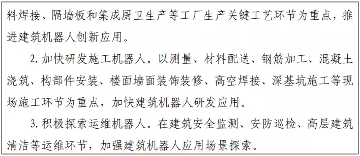 加強新型傳感、智能控制和優化、多機協同、人機協作等建筑機器人核心技術研究,研究編制關鍵技術標準,形成一批建筑機器人標志性產品。