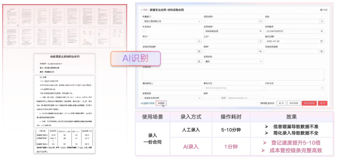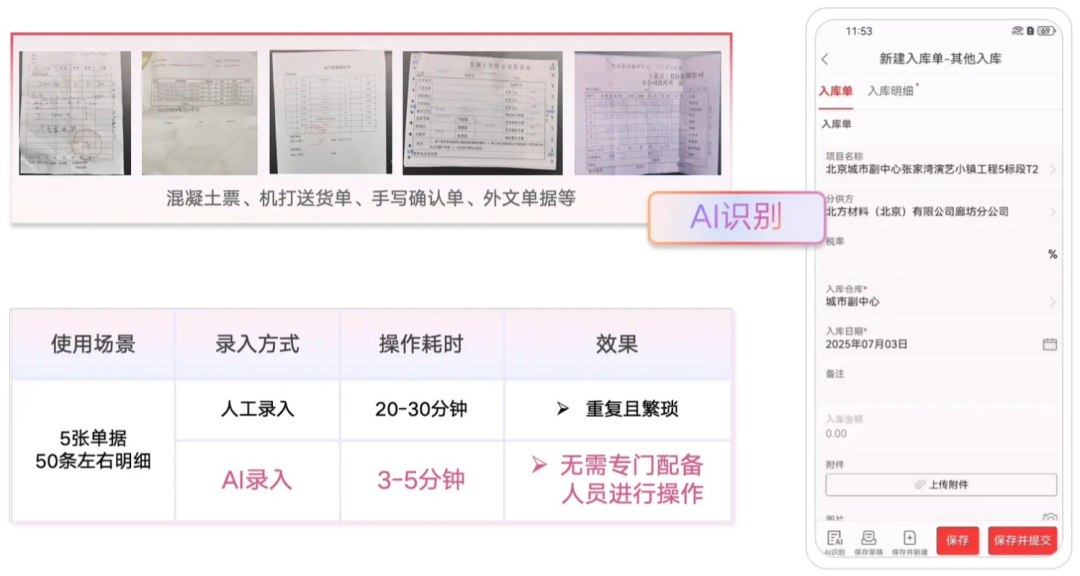 大量手寫確認單、混凝土票據(jù)、支出合同、機打送貨單和辦公登記表的錄入任務(wù),不管是在出差途中或辦公場景中,員工只需將紙質(zhì)單據(jù)拍照上傳,即可實現(xiàn)一鍵識別與系統(tǒng)自動錄入,徹底擺脫繁瑣工作、減少重復勞動。
